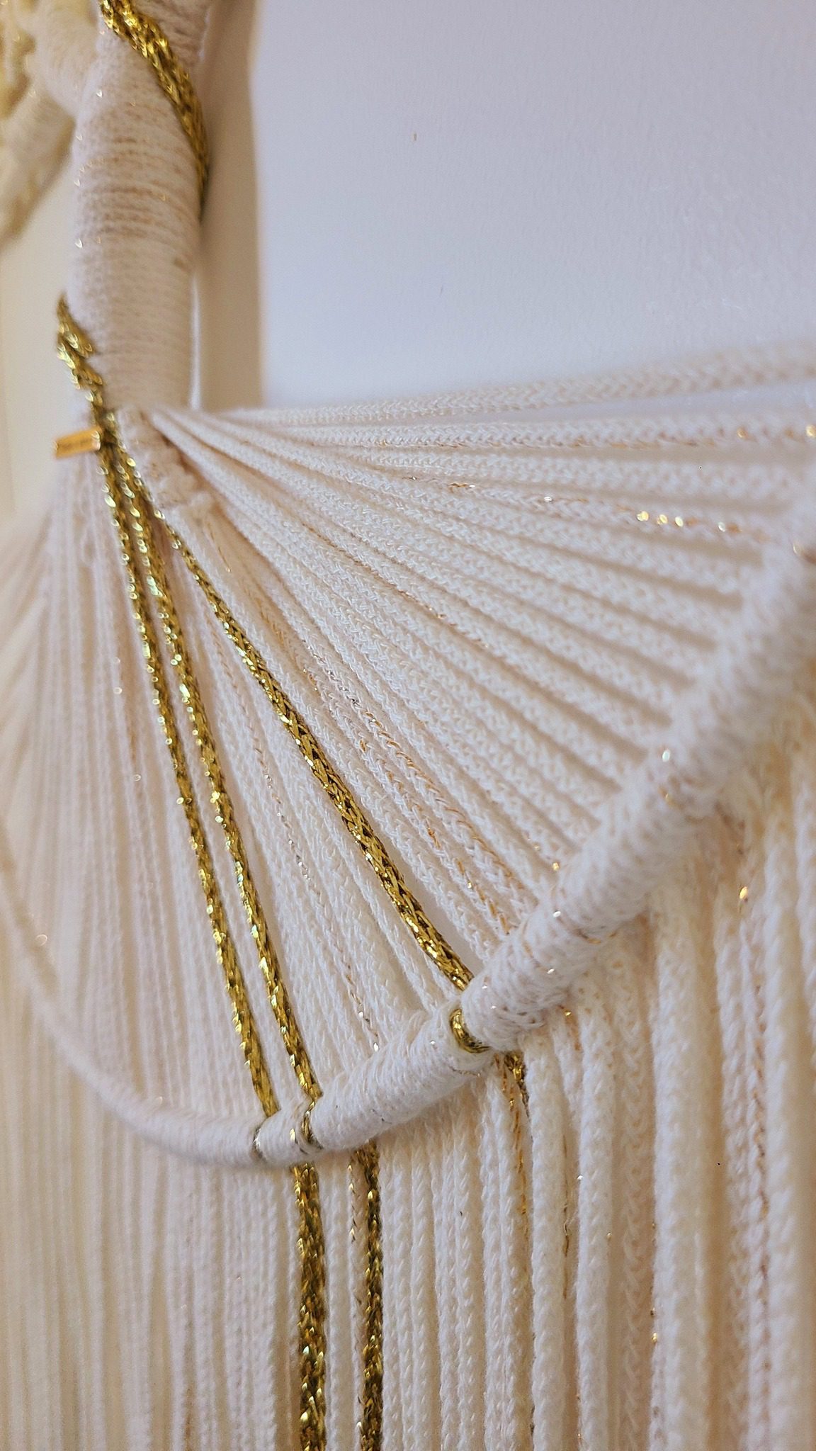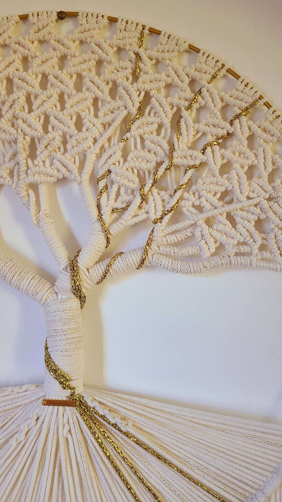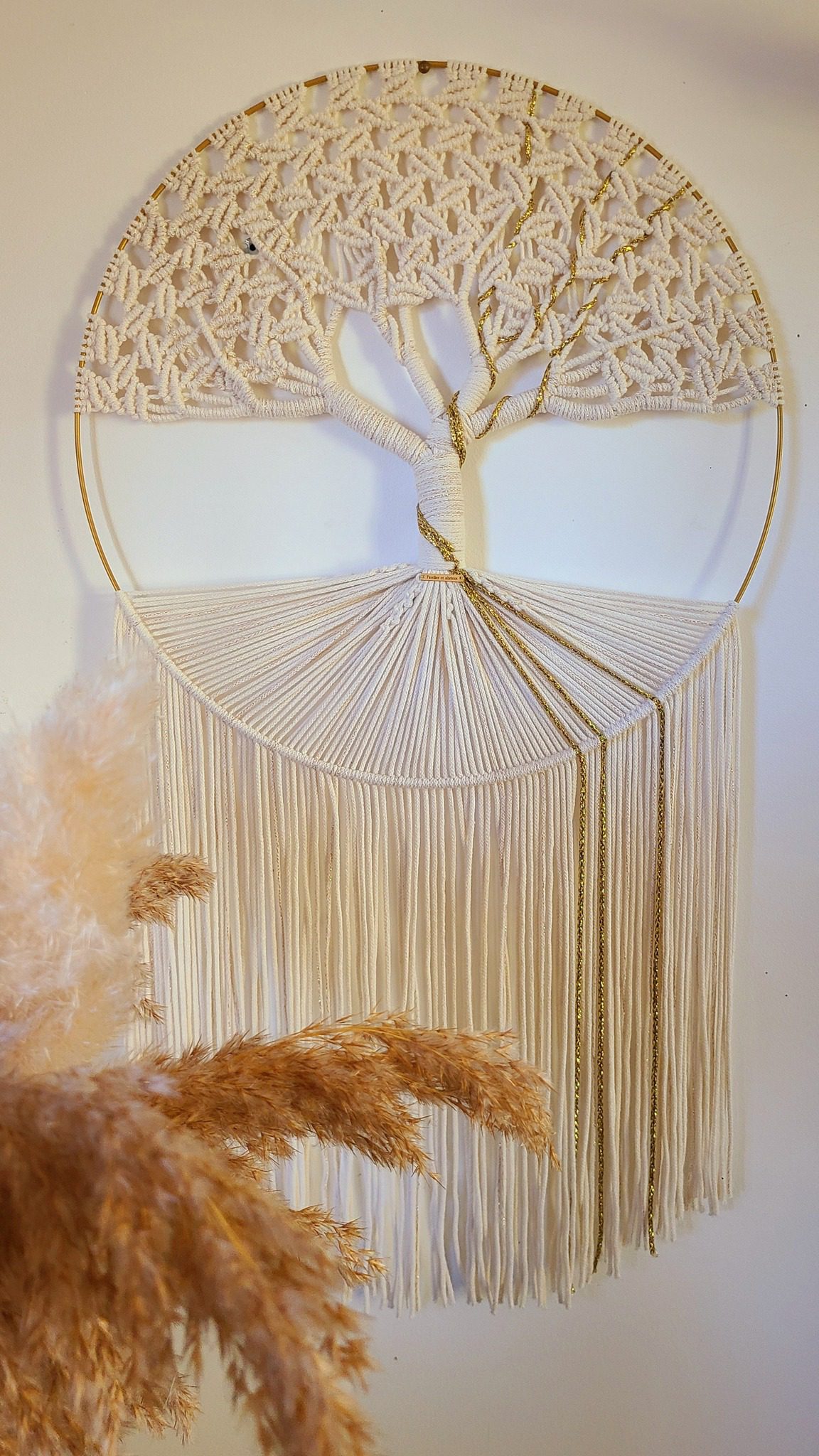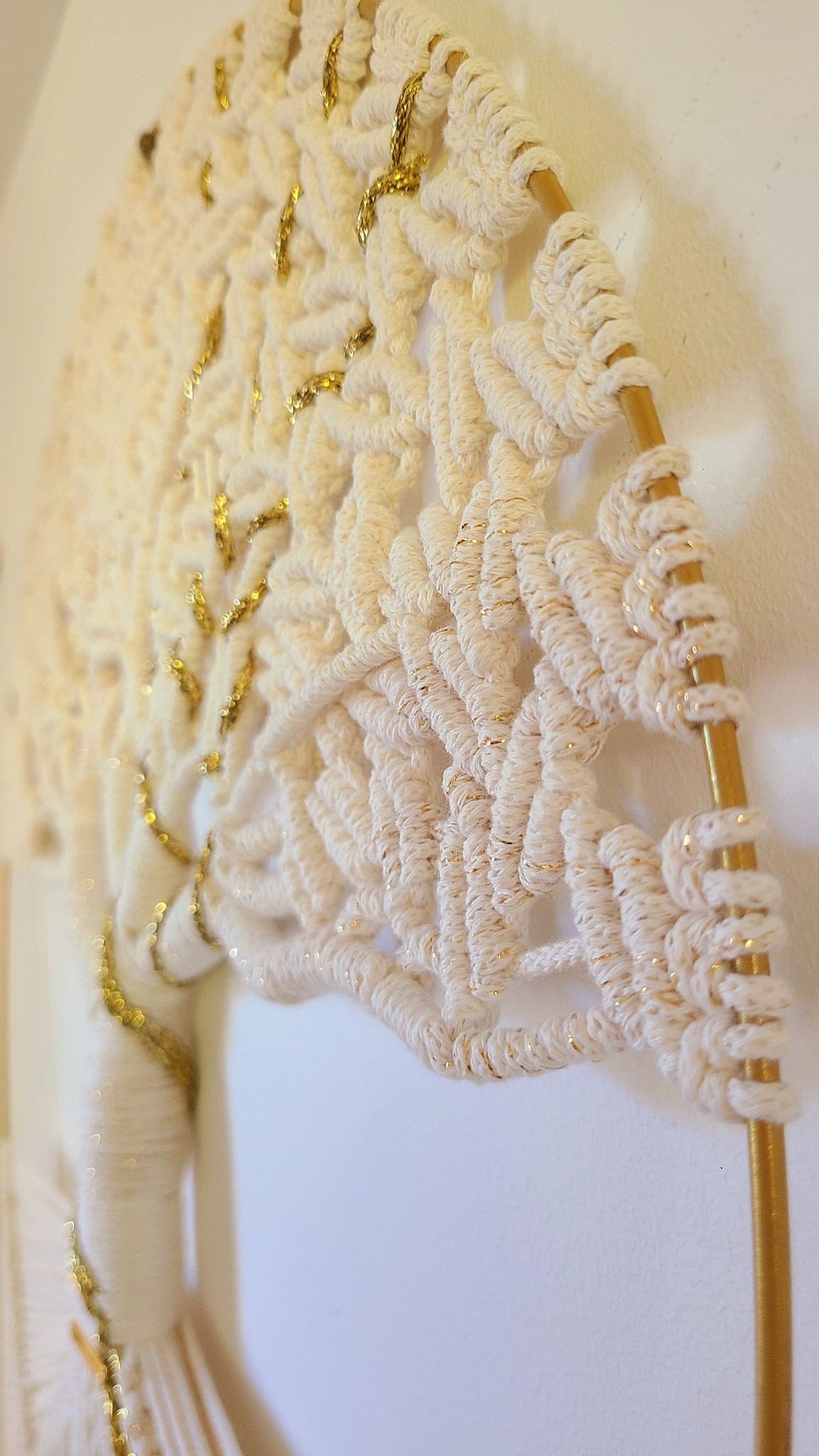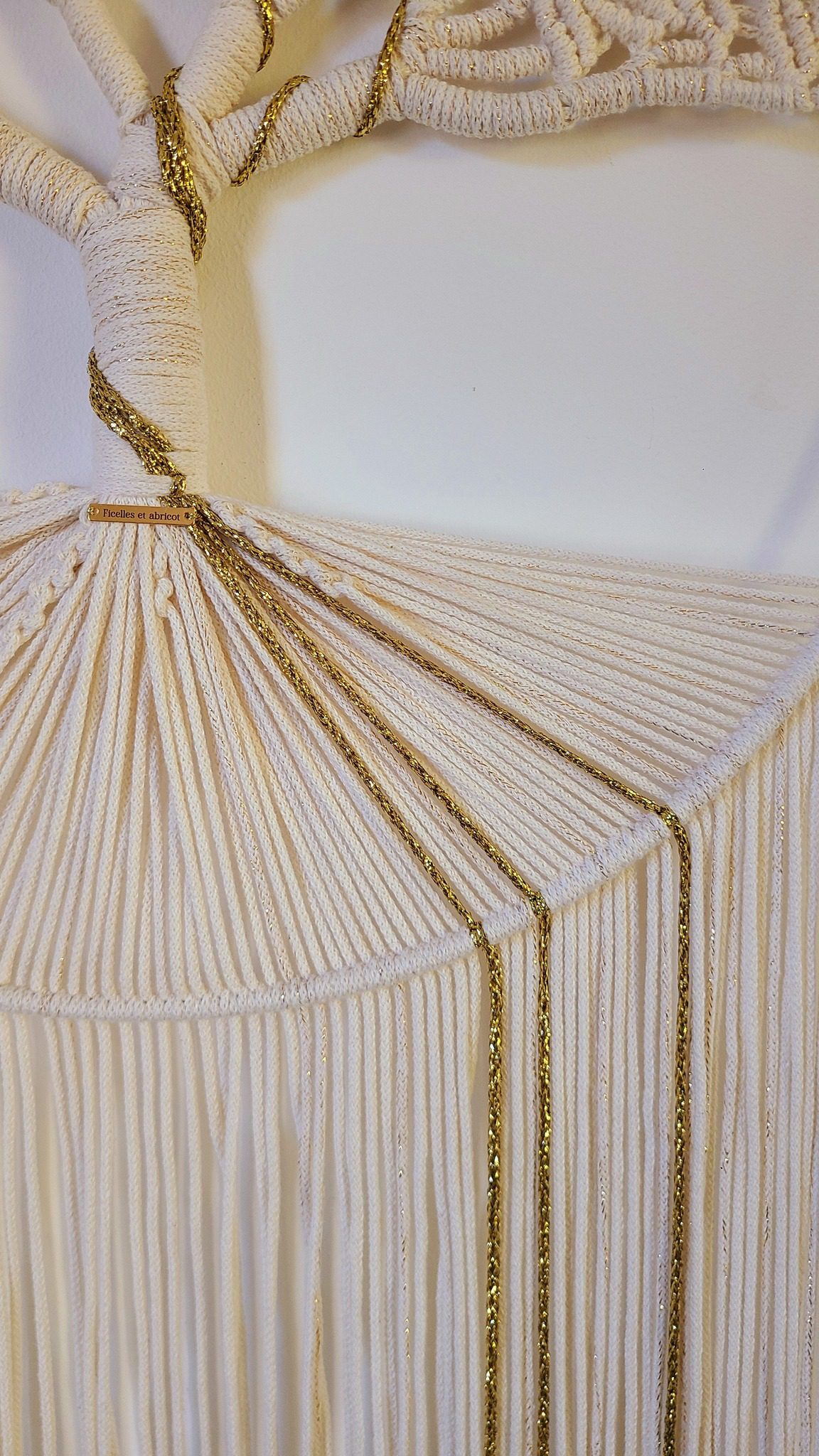 Un Arbre de Vie en macramé inspiré de l’art japonais du kintsugi, où les fils dorés subliment les « fissures » et rappellent que la beauté se trouve aussi dans les cicatrices. Une pièce symbolique puissante et lumineuse pour donner du sens et de la douceur à votre intérieur.