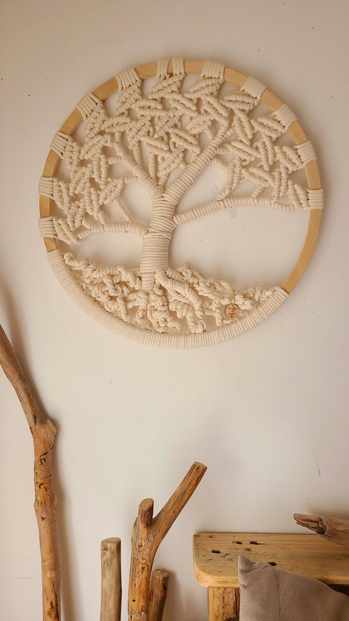 Son cercle en bois naturel de 40 cm de diamètre met en valeur un tissage travaillé autour d’un ancrage profond avec ses racines organiques, déssinées avec intention, qui rappellent la force tranquille d’un foyer aligné et apaisé.