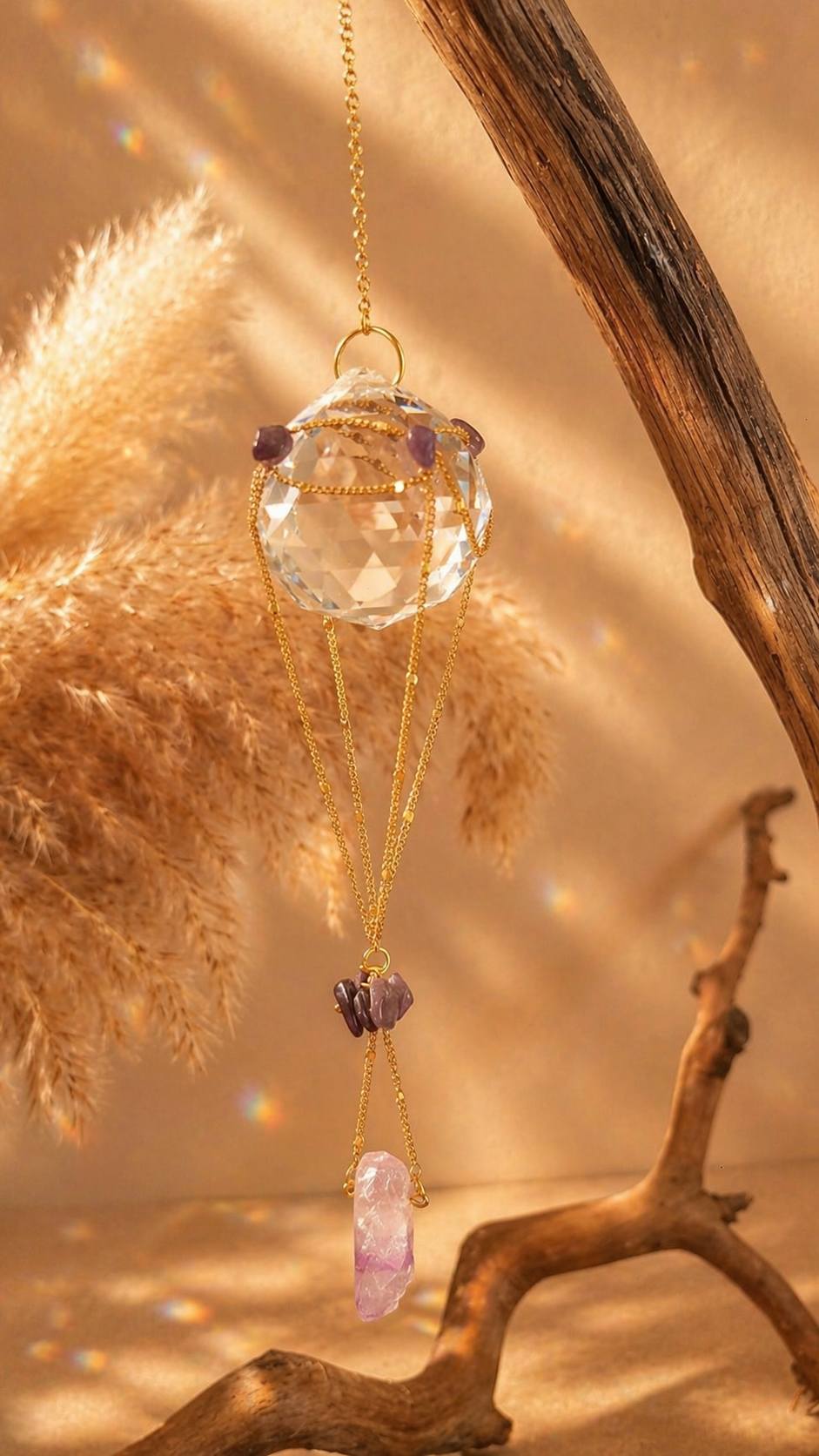 Suspendu près d’une fenêtre, don cristal capte les rayons du soleil et les transforme en éclats lumineux dans la pièce. Les pierres d’améthyste, aux nuances violettes apaisantes, viennent ancrer cette douceur dans une énergie calme et sereine.