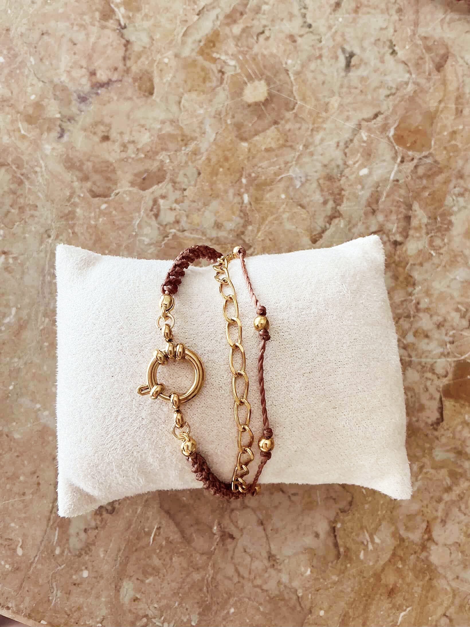 Ce trio de bracelet élégant et minimaliste incarne la féminité dans sa forme la plus subtile. Pensé comme une composition harmonieuse, il asssocie trois bracelets fins aux textures complémentaires. Un bracelet en micromacramé noisette, une chaîne délicate, un mélange des deux, symbole d’unité et d’équilibre.