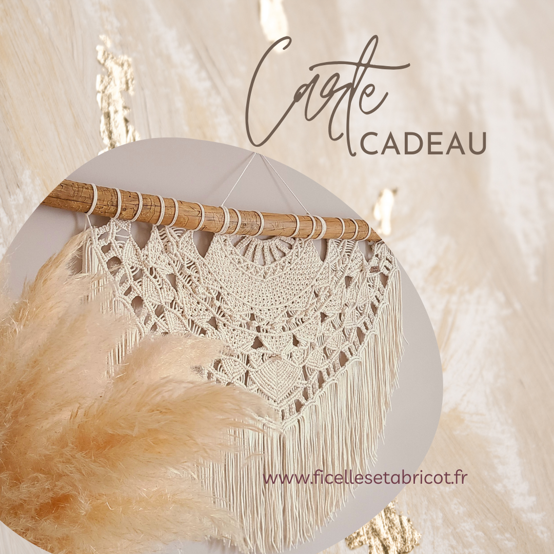 Avec les cartes cadeaux Ficelles et Abricot, vous offrez la possibilité à vos proches de choisir parmi une large gamme de produits artisanaux réalisés avec la technique du macramé.