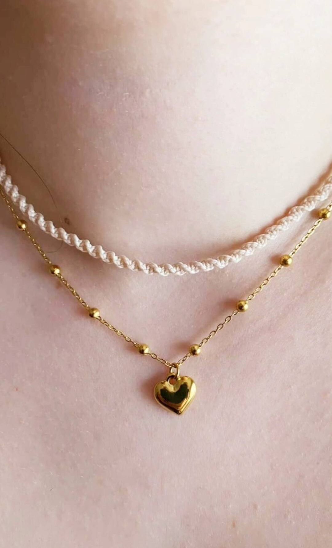 Ce collier double associe la délicatesse d’un ras de cou tissé à la finesse d’ue chaîne dorée ornée d’un pendentif coeur.