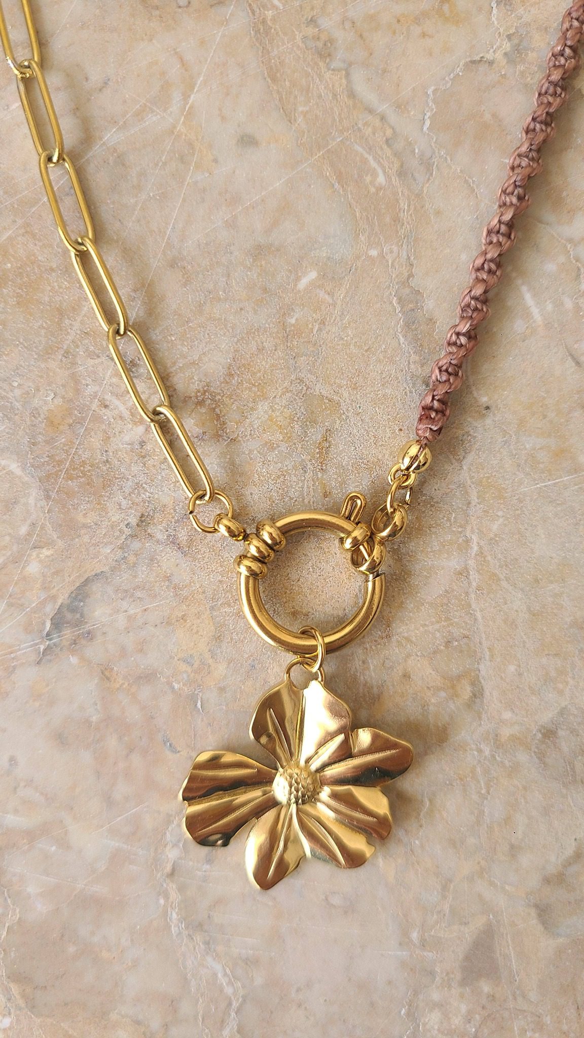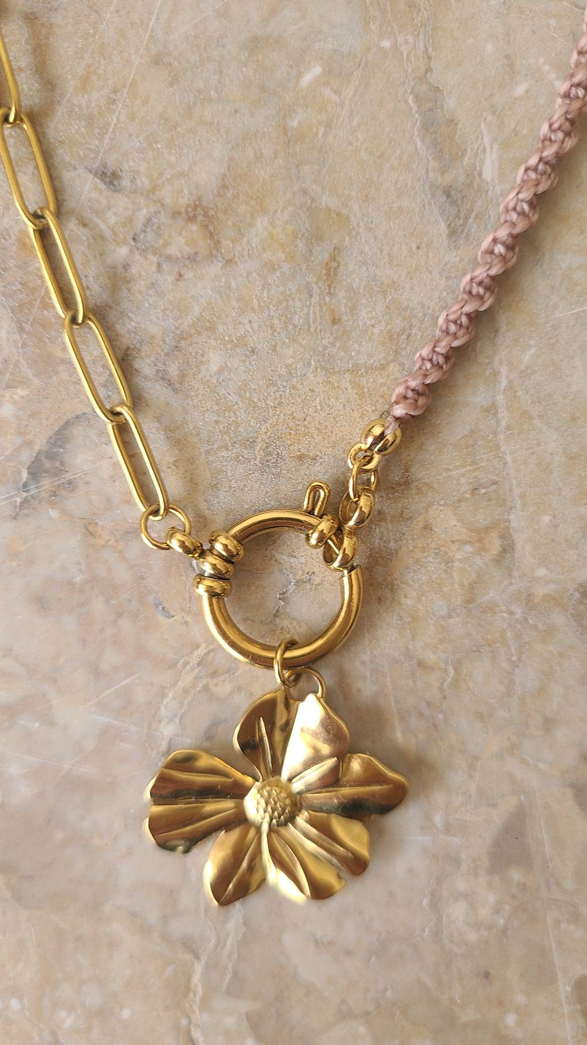 Le macramé est un micromacramé en coton ciré de qualité supérieure, subtilement satiné, tandis que la chaîne apporte la touche de raffinement et de modernité qui sublime la pièce. La chaîne a été choisi en acier chirurgical hypoallergénique plaqué or. Son tour de cou est de 48 cm.