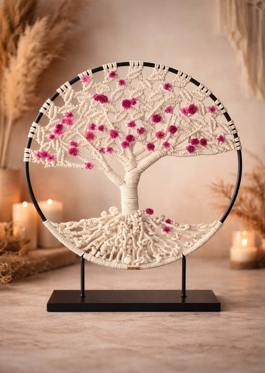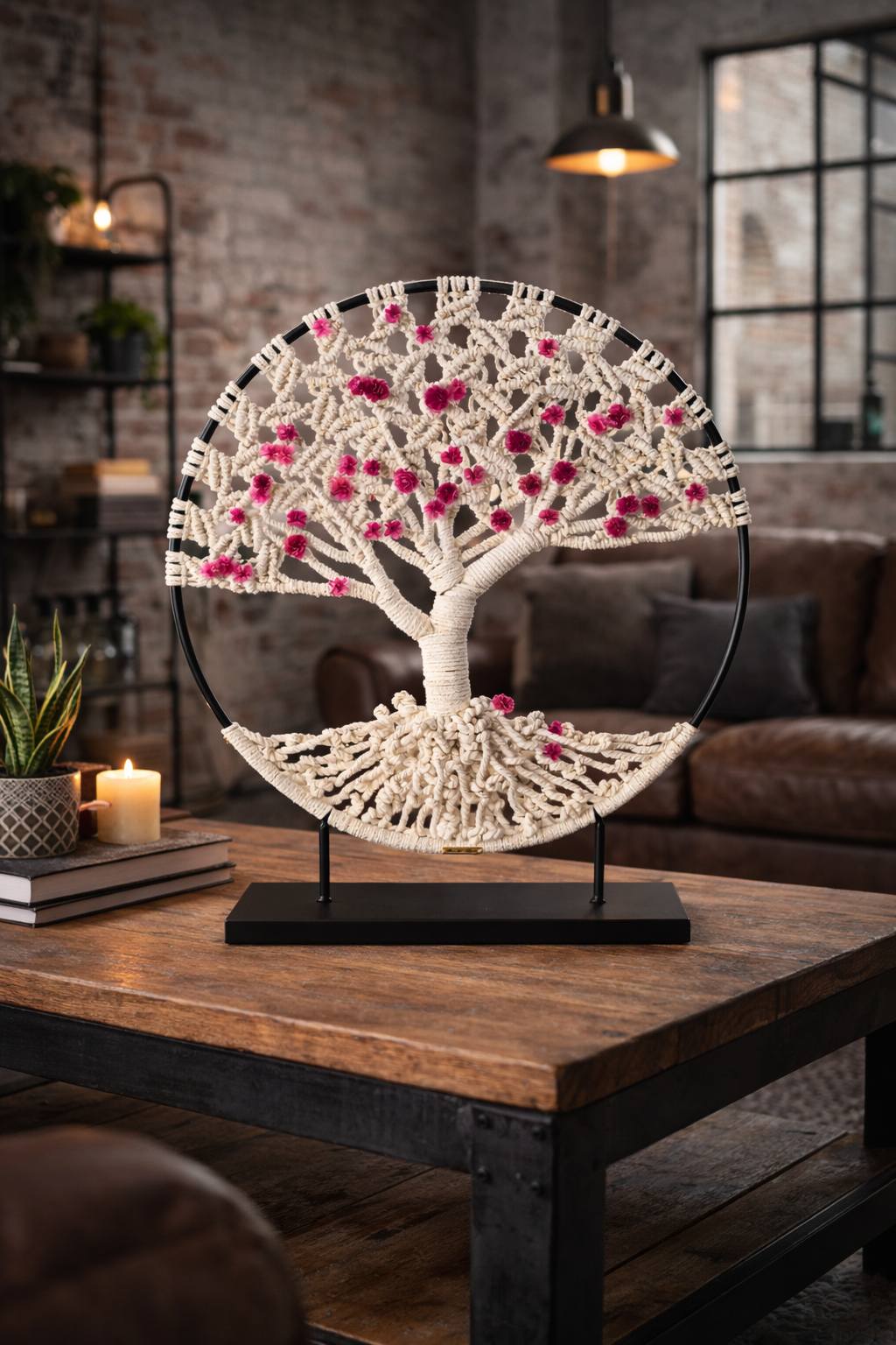 Son mélange de macramé contemporain avec son socle métallique et ses fleurs délicates lui permet de trouver sa place aussi bien dans un intérieur bohème et naturel que dans un univers plus industriel.