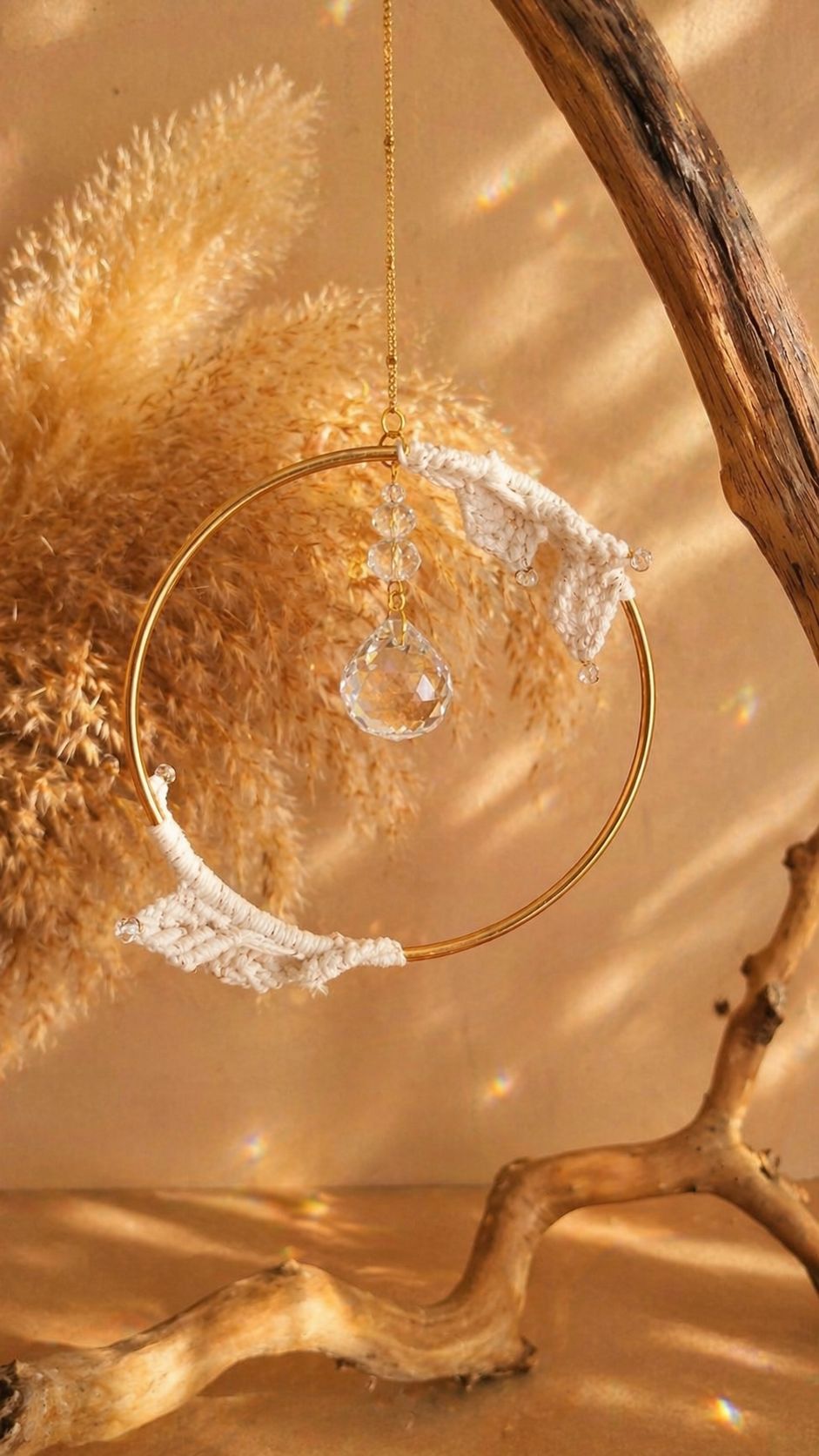 Perle de rosée – Attrape-soleil en macramé, feuilles tissées et cristaux