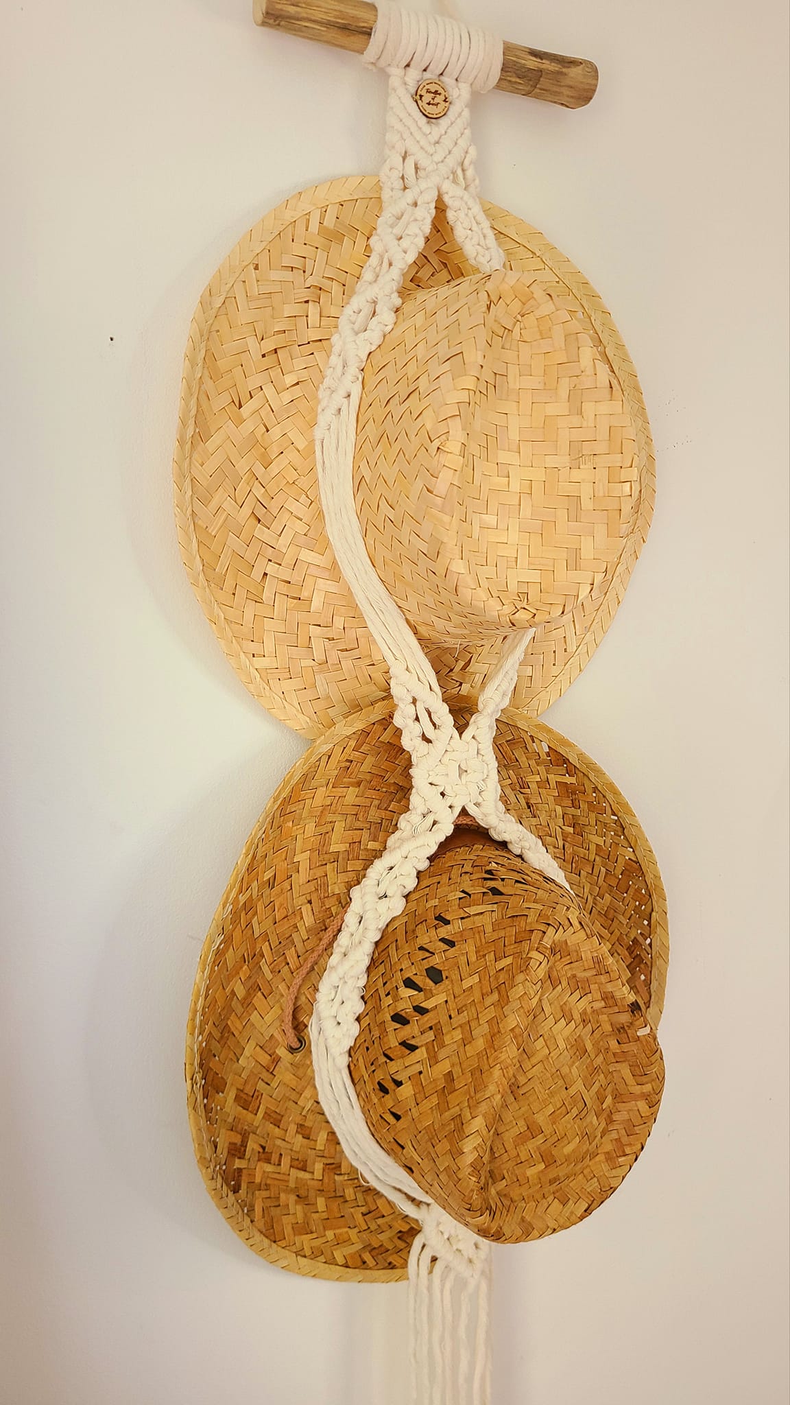 Ce porte-chapeaux est composé de deux espaces pour deux chapeaux, réalisé sur un bois offert par la nature, nettoyé et poncé par mes soins et un tissage en macramé. Il vous permet de ranger vos chapeaux de façon originale et élégante, tout en créant une ambiance bohème et naturelle dans votre pièce. En privilégiant les matières naturelles et douces, comme le coton et le bois flotté, vous apportez du confort, du charme et du caractère à votre espace tout en créant un lien avec la nature et ses bienfaits.